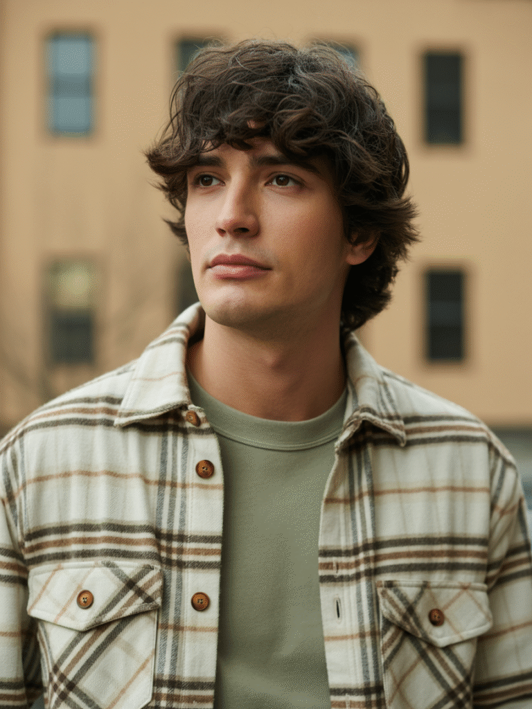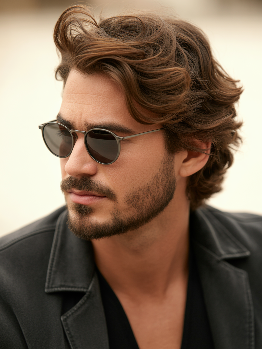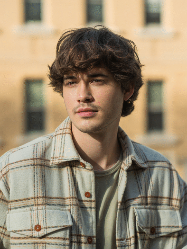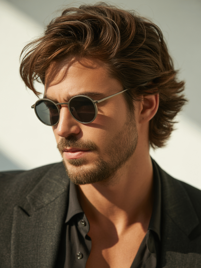 Revivendo os anos 60, o Beatles style com franja reta e laterais curtas ganha camadas suaves. Funciona em cabelos lisos e cacheados, adicionando um ar intelectual. Combine com barba aparada para o look completo.