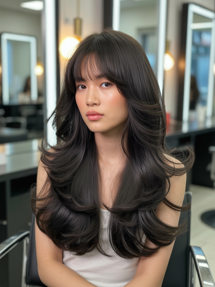 Fechando a lista, o corte butterfly não poderia ficar fora desta lista. Em 2026 esse corte continuara fazendo o coração de quem cabelos longos e ama movimento e leveza. Com suas camadas generosas por toda a extensão do comprimento garantindo o sucesso por onde você passar! Espere ver isso em desfiles de primavera/verão.